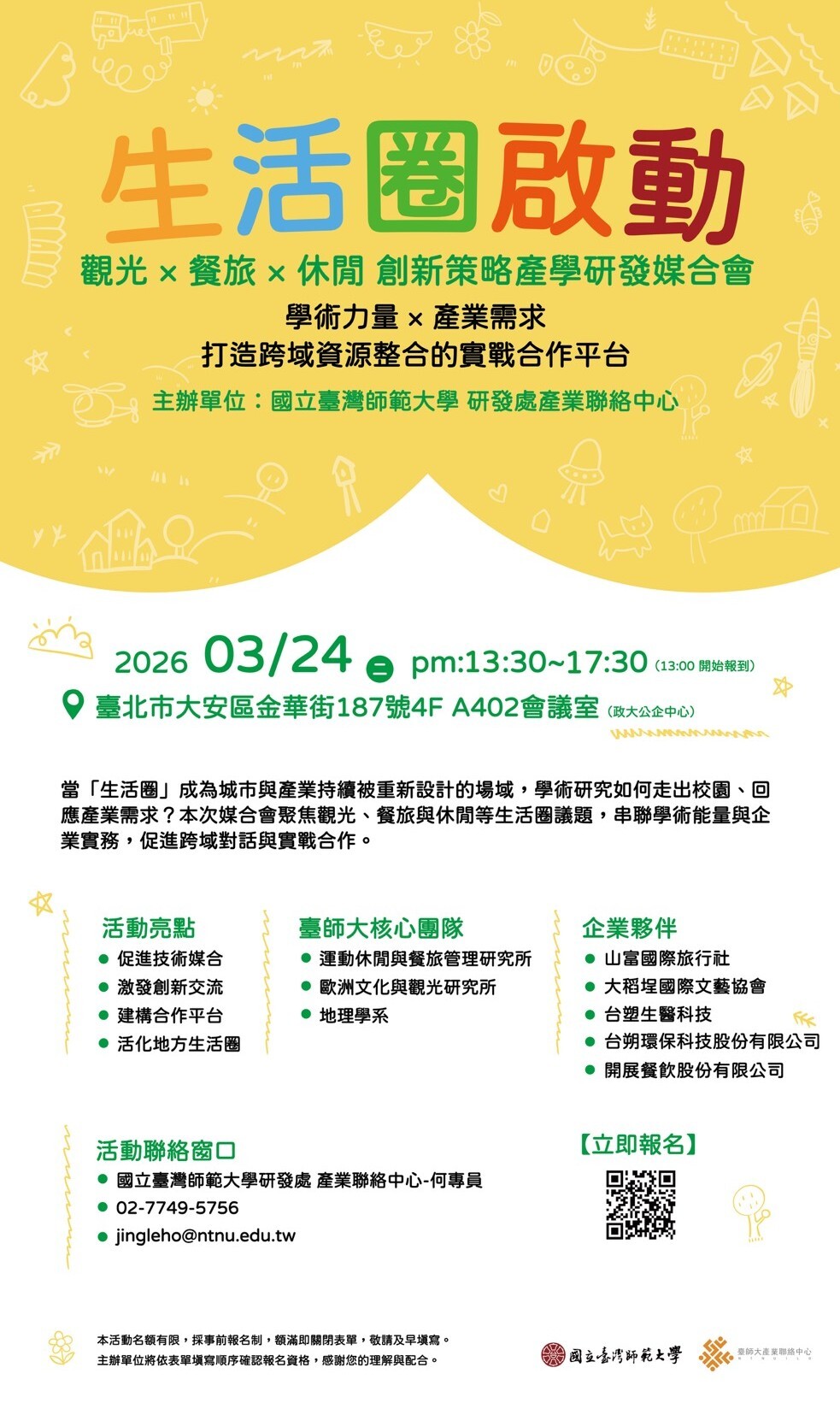 【活動資訊】臺灣師範大學「生活圈啟動!觀光、餐旅、休閒創新策略產學研發媒合會」
